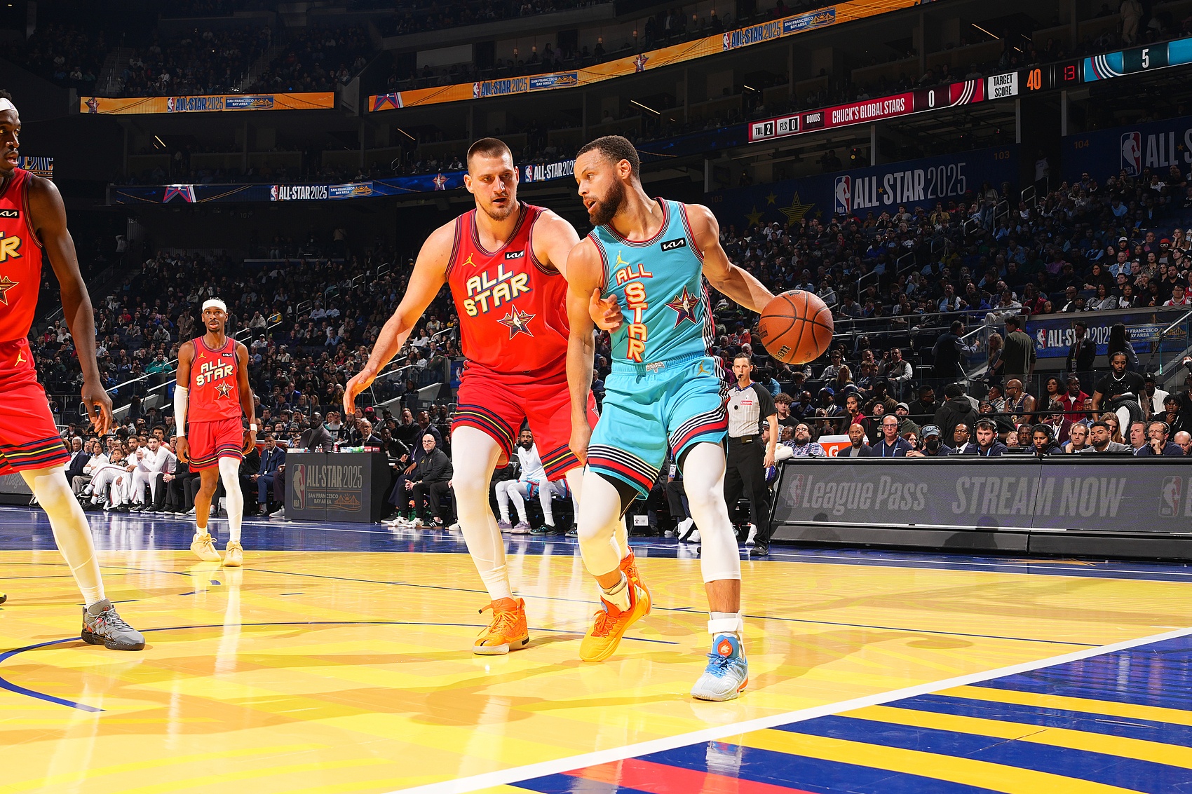 比賽中,庫里先是騎馬射箭三分,之后又飆中Logo超遠(yuǎn)三分,點燃全場。