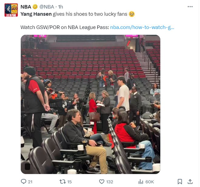 賽前楊瀚森將他的球鞋送給了一位小球迷,NBA官方都十分的羨慕,這說明小楊的影響力的確已經(jīng)形成一定的規(guī)模。