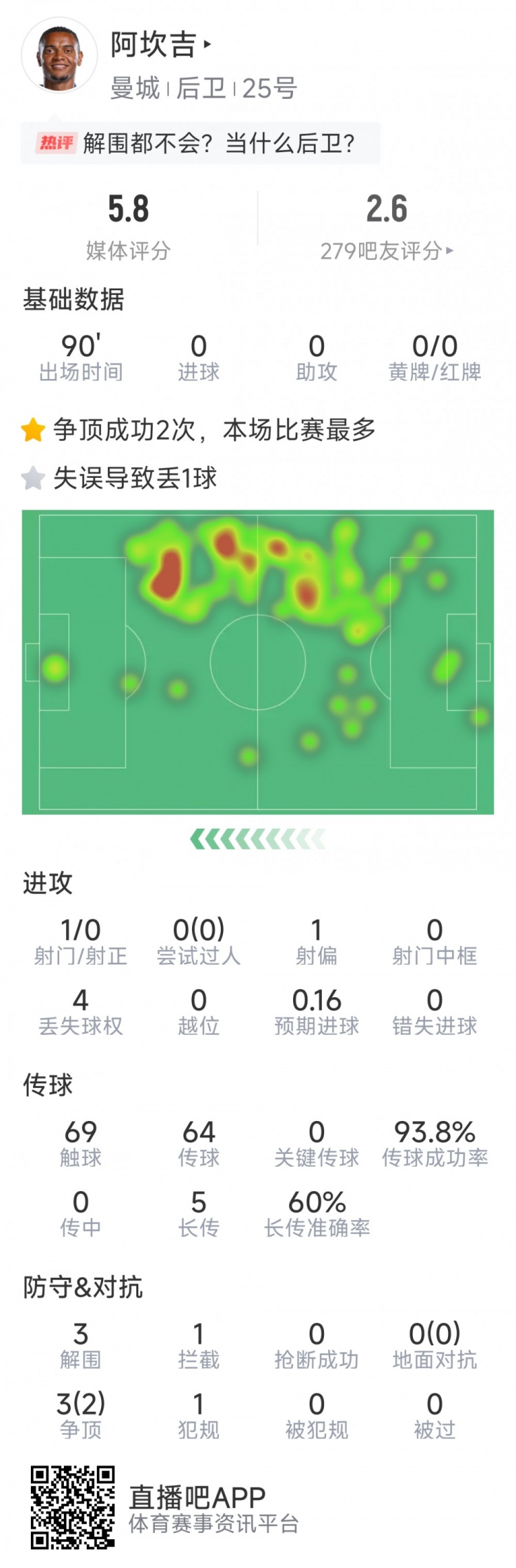 2月3日訊 在本輪英超,曼城1-5不敵阿森納。本場比賽阿坎吉開場失誤送禮,以下為他在本場數(shù)據(jù):
