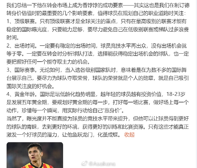 我之前寫了篇介紹胡桑諾夫的長微博,提出了一個球員曝光度對于球員職業(yè)生涯和能力影響的問題。其實當時有很大程度上是寫給準備迎接各級大賽的各年齡段國足,尤其是當時正在備戰(zhàn)亞青賽的國青隊員和家長們看的。很巧,我看到賽后有很多人也都在為國青球員們失去了在世界球探面前展現(xiàn)自己的機會而惋惜不已。一個有才華的球員,只有在足夠的曝光度下,才能從被忽視的角落走向舞臺的中央,迎接屬于自己的機遇與挑戰(zhàn)。只有當他站在更廣闊的平臺上,才能借助更強大的資源,迅速提升自我,釋放潛力,達到職業(yè)巔峰。但是真的很可惜,可惜到我已經(jīng)不想去回想下午那場球了。