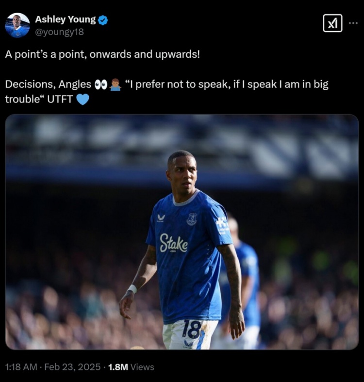 阿什利-揚(yáng)寫(xiě)道:一分就是一分,讓我們繼續(xù)前進(jìn)吧。判罰,角度????‘我寧愿不說(shuō)話,如果我說(shuō)了,我會(huì)有大麻煩?!佑吞?!