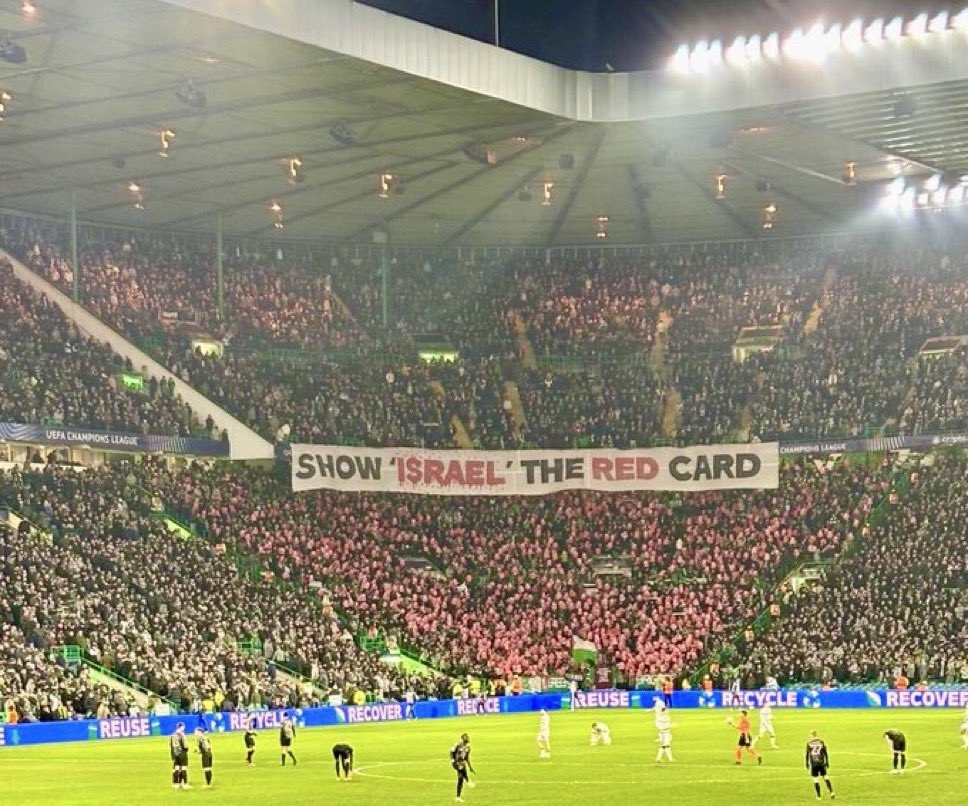 抗議以色列,凱爾特人球迷在對陣拜仁時舉橫幅:向以色列出示紅牌