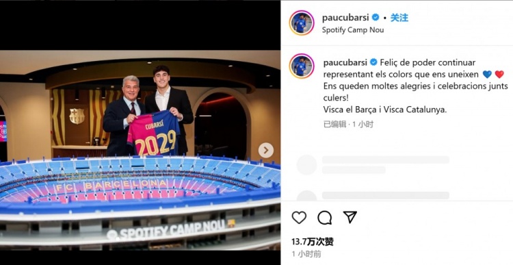 庫巴西本人也通過社媒曬出自己和巴薩主席拉波爾塔的合照,兩人共同手持印有2029字樣的巴薩球衣,庫巴西還表示:“很高興能夠繼續(xù)為巴薩俱樂部效力??????,我們還會共同經歷很多歡樂與慶祝,巴薩球迷們!巴薩萬歲!加泰羅尼亞萬歲!”