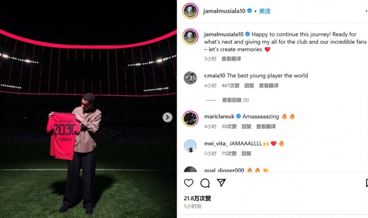 穆西亞拉曬出自己手持印有2030字樣的拜仁球衣照,并表示:“很高興能夠繼續(xù)這段旅程。已經(jīng)準備好為我們的俱樂部以及令人難以置信的球迷們竭盡全力了!讓我們共同創(chuàng)造更多美好的記憶吧??”。